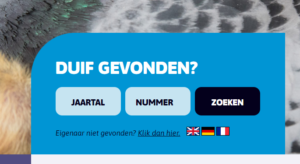 Wanneer u een Nederlandse postduif opvangt, kunt u de eigenaar vinden via www.duivensportbond.nl. Op deze pagina vindt u een blauw blokje met “Duif gevonden”.